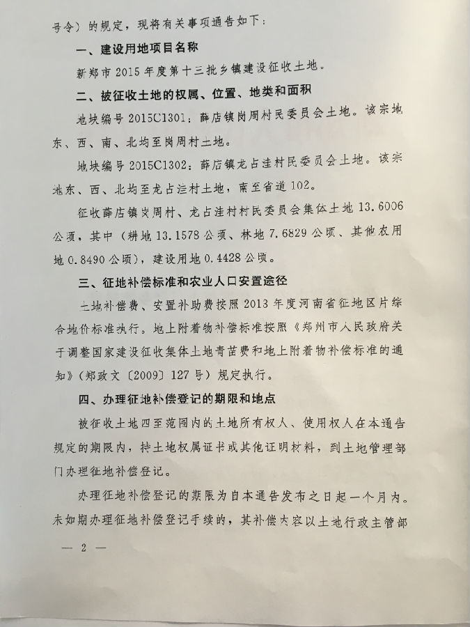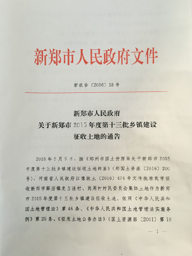 新郑市人民政府关于新郑市2015年度低十三批乡镇建设征收土地的通告
