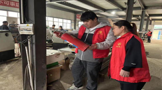 在军之兴机械有限公司,平安办主任沈伟举带领消防安全服务中心工作人员,重点查看生产车间、消防设施及用电用气情况,现场指出隐患问题,提出整改要求。