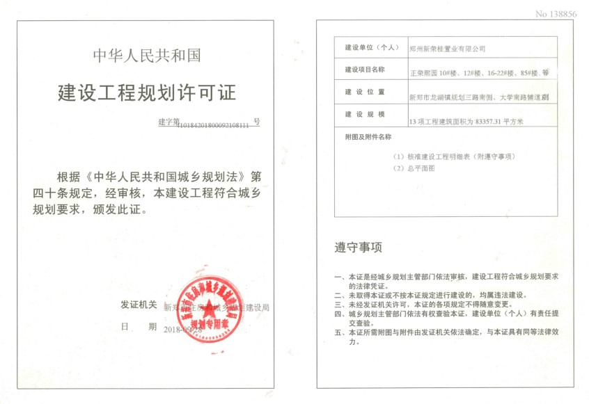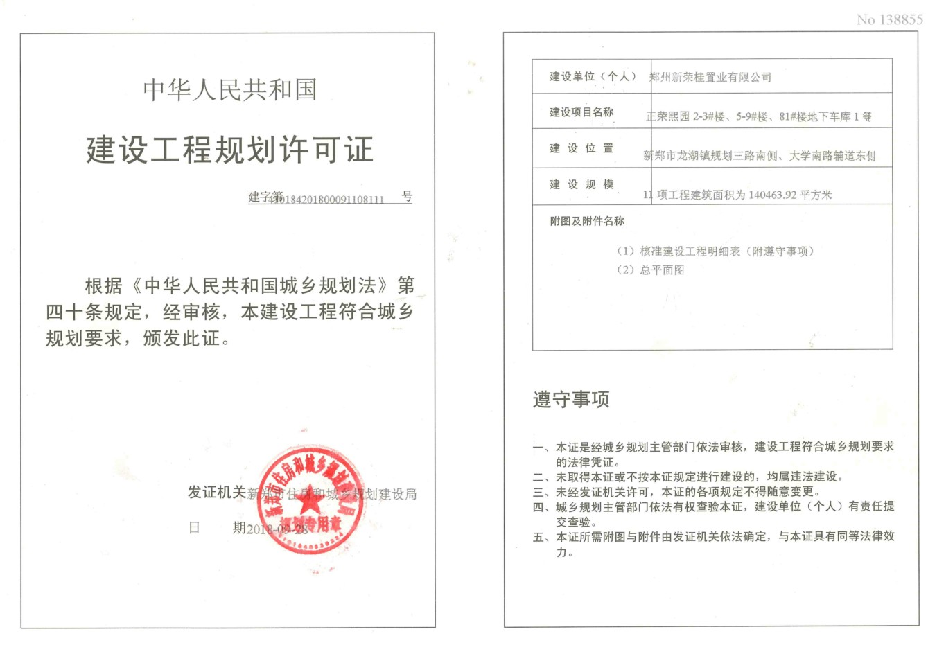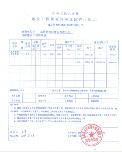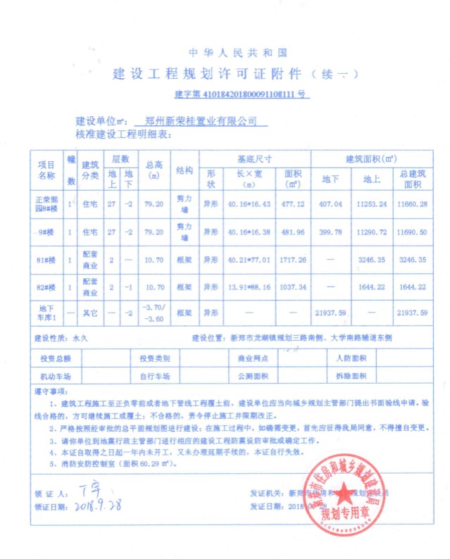 由郑州新荣桂置业有限公司有限公司建设的项目,已在我中心办理建筑审批手续,根据有关法律、法规和《河南省城市规划公示制度》的要求,现予以公示:附图:建设工程规划许可证正本 附件 总平面图 该项目公示期为2018年09月30日至规划竣工验收通过之日,如有意见或建议,请于公示期内向新郑市规划发展服务中心建管科反馈。经办科室:新郑市规划发展服务中心建管科 新郑市规划发展服务中心信访意见电话:0371---69953598