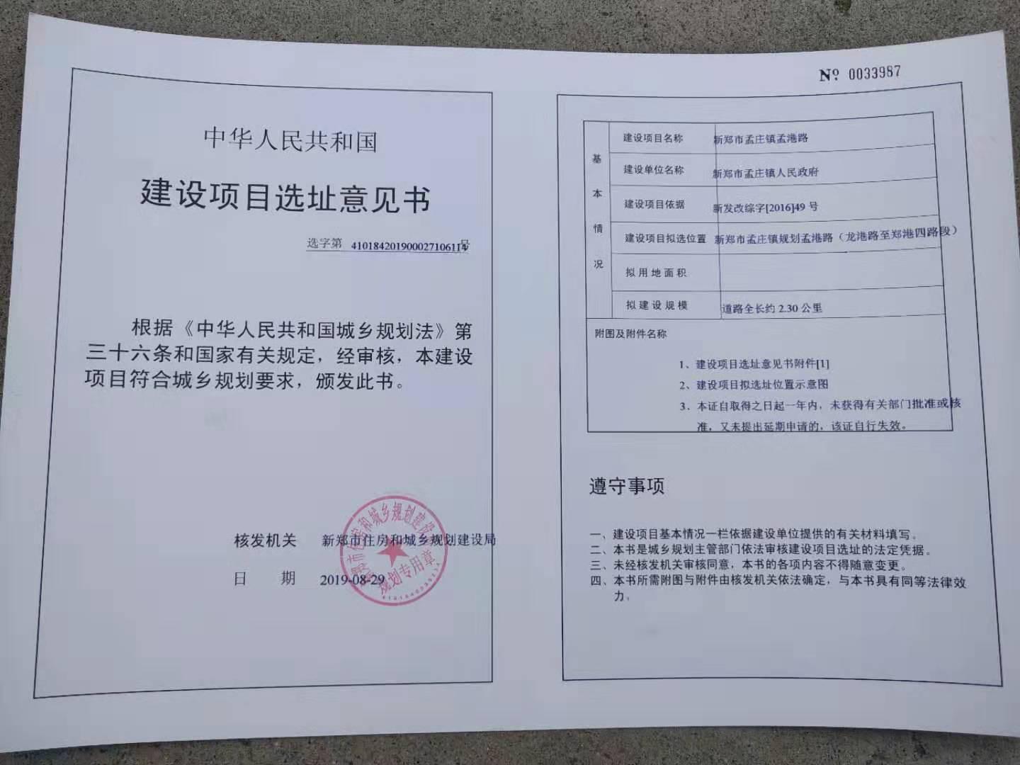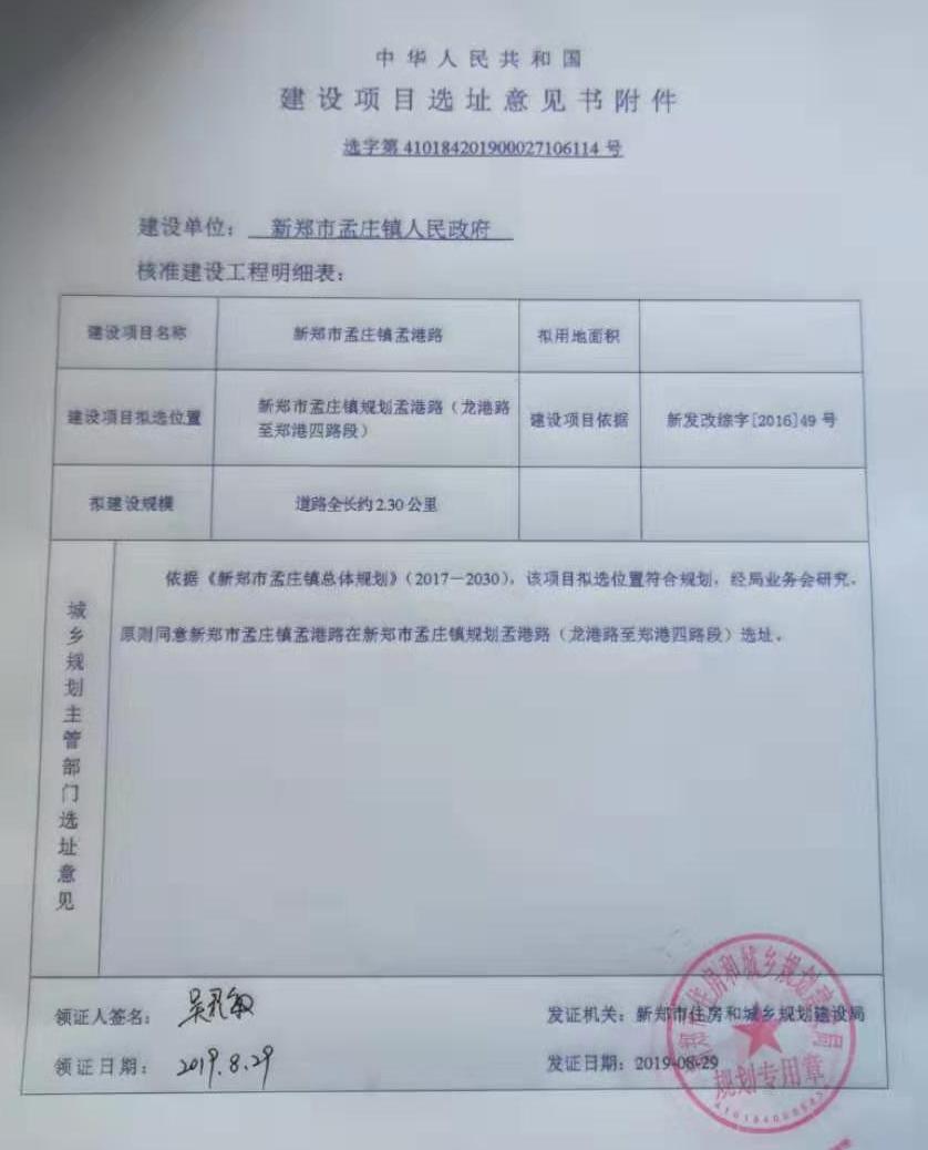 新郑市孟庄镇孟港路选址意见书已核发,依据相关规定,现予以公示: