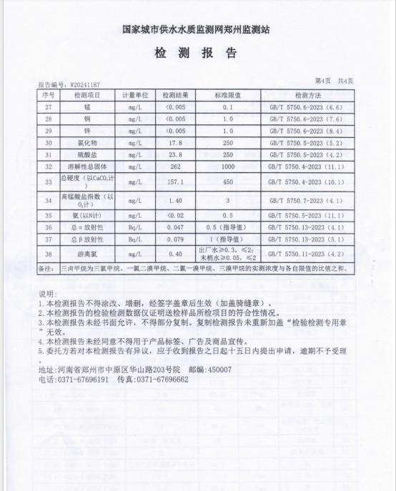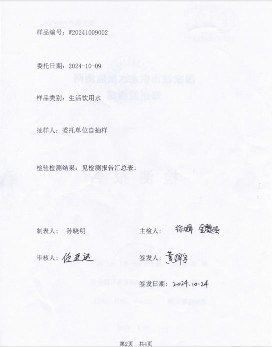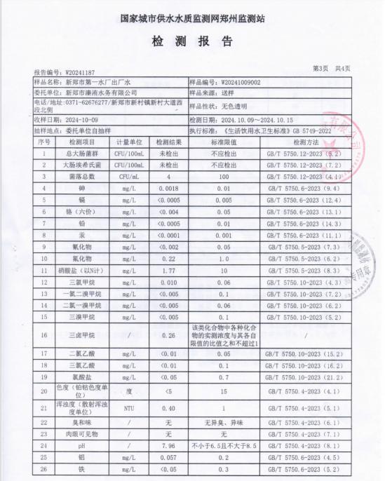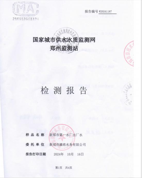 根据《生活饮用水卫生监督管理办法》、《生活饮用水卫生规范》规定,新郑市卫生计生监督所联合新郑市城镇用水管理所每月对市政供水第一水厂进行监督检查和出厂水采样监测,现将2024年10月水质检测结果予以公示:
