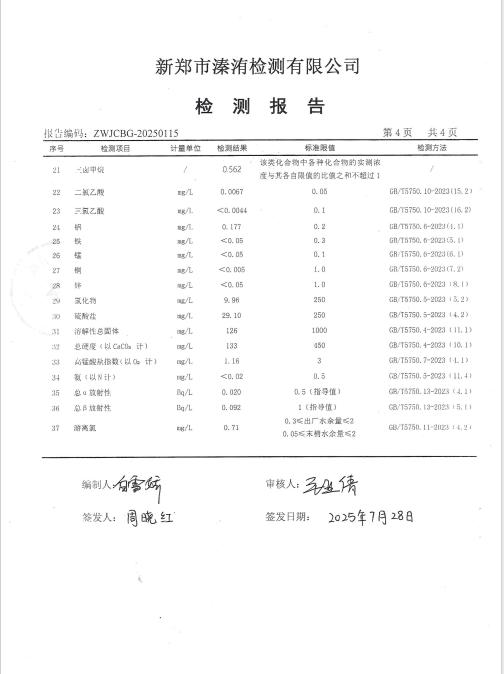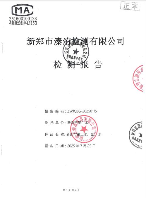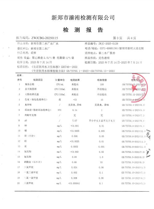 根据《生活饮用水卫生监督管理办法》、《生活饮用水卫生规范》规定,新郑市疾病预防控制中心联合新郑市城镇用水管理所每月对市政供水第二水厂进行监督检查和出厂水采样监测,现将2025年7月水质检测结果予以公示: