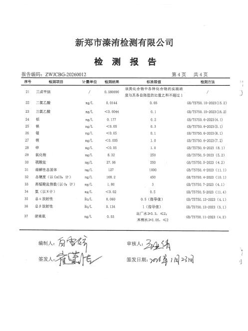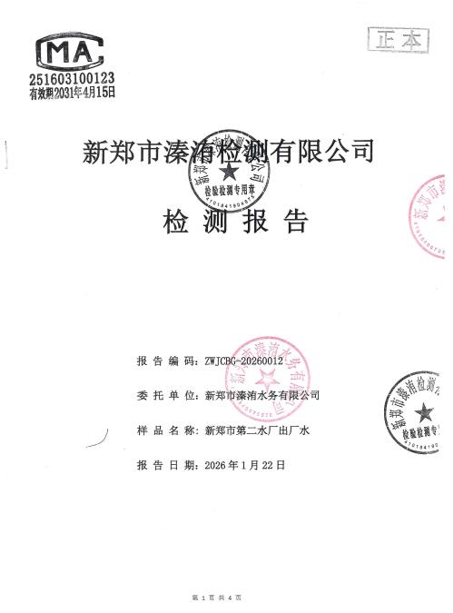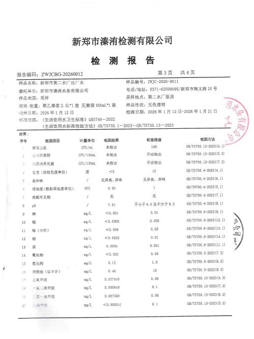 根据《生活饮用水卫生监督管理办法》、《生活饮用水卫生规范》规定,新郑市疾病预防控制中心联合新郑市城镇用水管理所每月对市政供水第二水厂进行监督检查和出厂水采样监测,现将2026年1月水质检测结果予以公示: